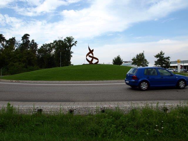 Auch Waghäusel ist fällig und soll ein Opfer der Bürokratie werden. Aufgrund der auf die Seiten ausweichenden Fahrbahnteiler kommt kein Mensch auf den Kreisel. Gottlob will die Stadt nicht zulassen, dass (laut BNN vom vergangenen Samstag) der Landkreis als Ausführender des Landes die stählerne Skulptur auf dem Kreisel am Westrand von Kirrlach auf der L 555 beziehungsweise L 556 entfernt.