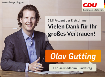 23. September 2013 Vielen Dank für den VertrauensbeweisSieger der Bundestagswahl 2013 ist zweifelsohne die CDU. Ein Superergebnis gab es auch im „Spargelwahlkreis“ Bruchsal/Schwetzingen. Die Union und der mit deutlicher Mehrheit wiedergewählte Bundestagsabgeordnete Olav Gutting bedanken sich hiermit bei allen Wählerinnen und Wähler, besonders bei denen in Waghäusel. Gutting bedankte sich ausdrücklich bei den Waghäuselern für ihr „tolles Engagement“ im Wahlkampf.